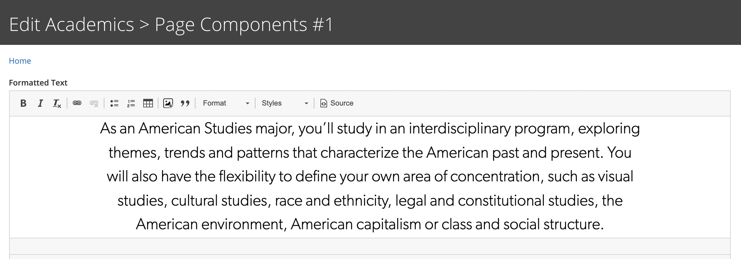 Formatted Text Blocks (FTBs) are the meat and potatoes of your site, and replace the "Body" field you may recall from your old website. FTBs can be used in almost all page types, wherever you want to have text with (or without) embedded links, images, etc. Whenever you add the FTB page component, you'll simply see the familiar Drupal text editor appear. Like with any other page component, you can add multiple FTBs to a page if you want to space out sections of text amongst other components (news, events, etc.)